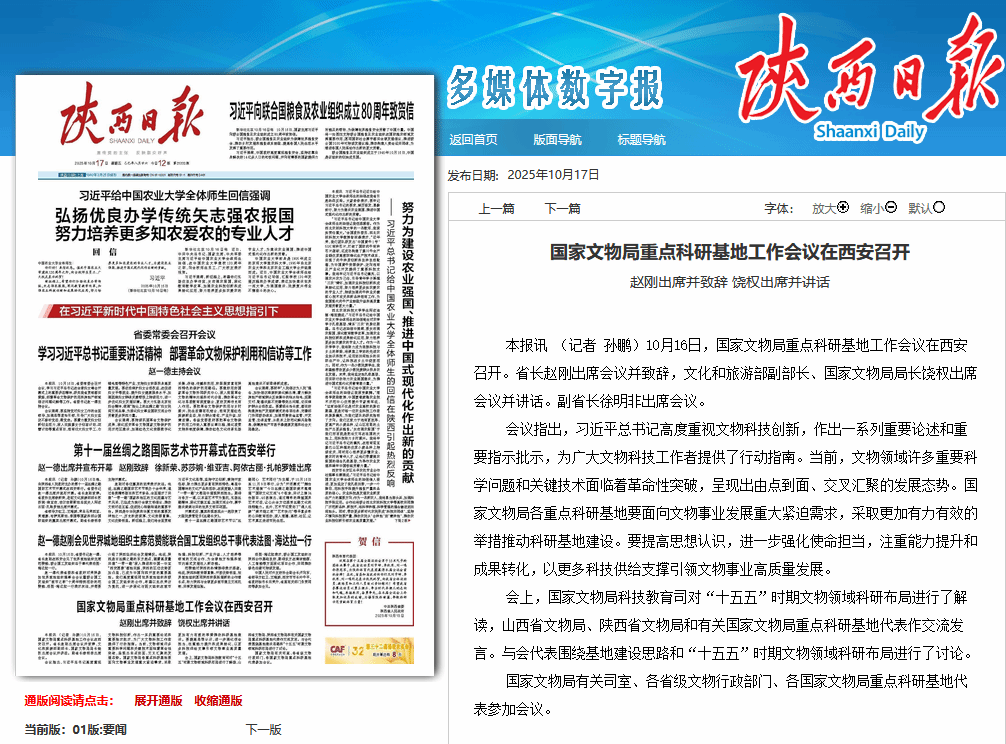 10月16日,国家文物局重点科研基地工作会议在陕西西安召开。省长赵刚出席会议并致辞,文化和旅游部副部长、国家文物局局长饶权出席会议并讲话。副省长徐明非出席会议。